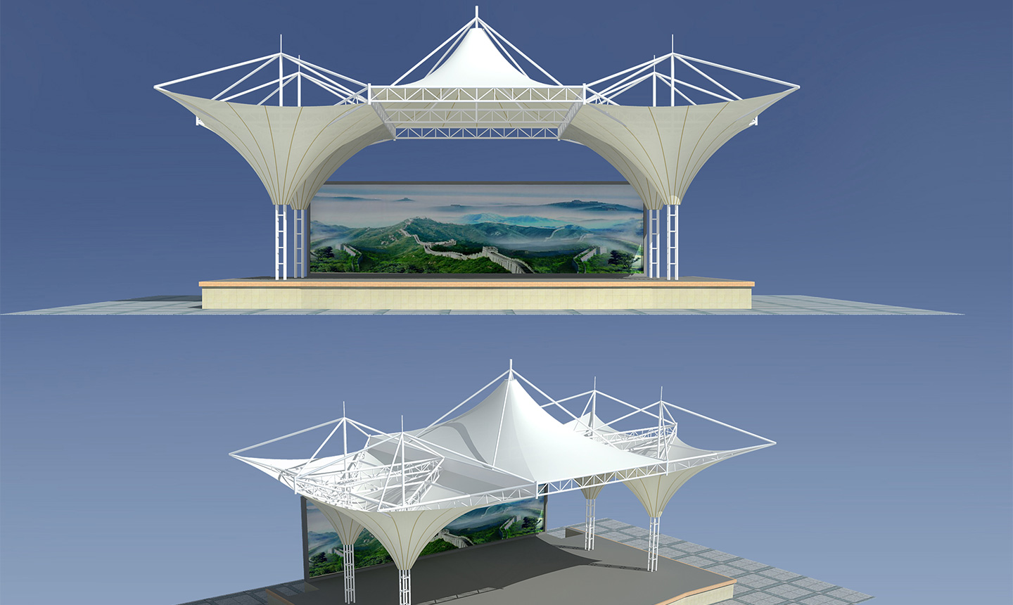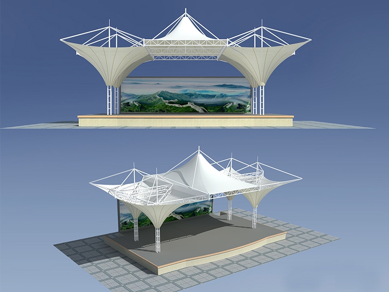 1、舞臺(tái)張拉膜結(jié)構(gòu)的共同曲面外形使其具有激烈的雕塑感,膜面經(jīng)過張力到達(dá)自平衡。