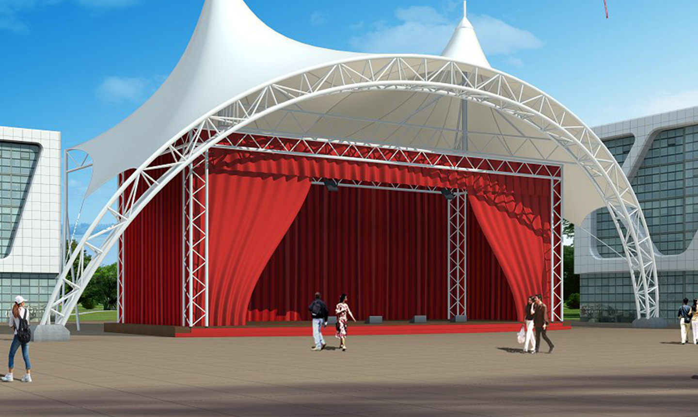 1、舞臺張拉膜結(jié)構(gòu)的共同曲面外形使其具有激烈的雕塑感,膜面經(jīng)過張力到達(dá)自平衡。