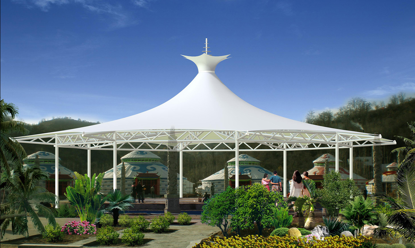 1、舞臺(tái)張拉膜結(jié)構(gòu)的共同曲面外形使其具有激烈的雕塑感,膜面經(jīng)過張力到達(dá)自平衡。