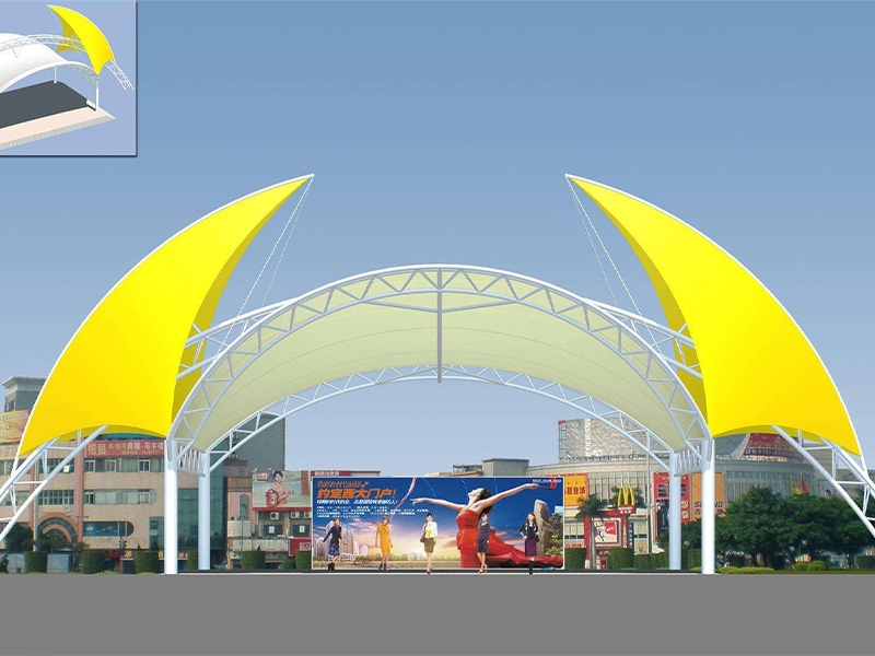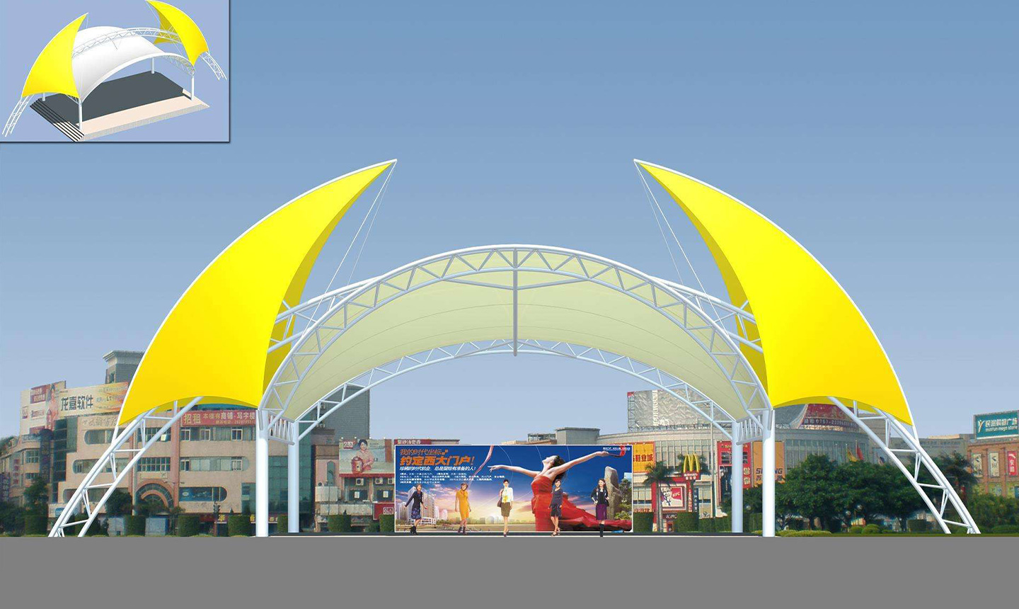 1、舞臺張拉膜結構的共同曲面外形使其具有激烈的雕塑感,膜面經過張力到達自平衡。