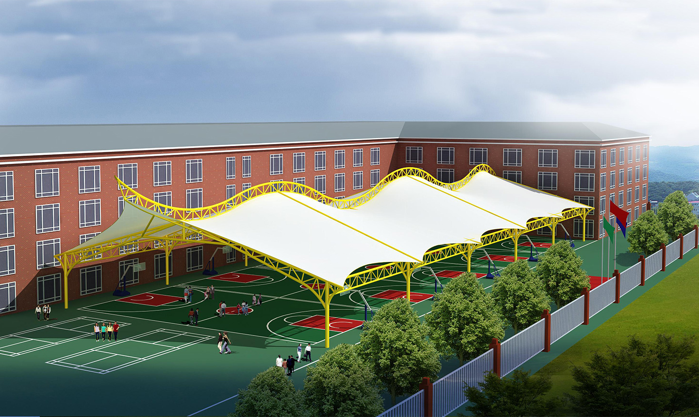 一、對(duì)于場(chǎng)地要求低,基本上所有球場(chǎng)地都可以做膜結(jié)構(gòu)頂棚,相比混凝土結(jié)構(gòu)的風(fēng)雨球館,施工周期短,造價(jià)低。