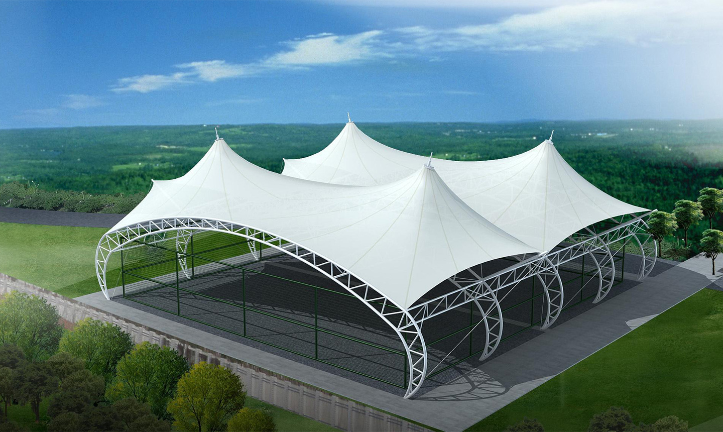 一、對于場地要求低,基本上所有球場地都可以做膜結(jié)構(gòu)頂棚,相比混凝土結(jié)構(gòu)的風(fēng)雨球館,施工周期短,造價低。