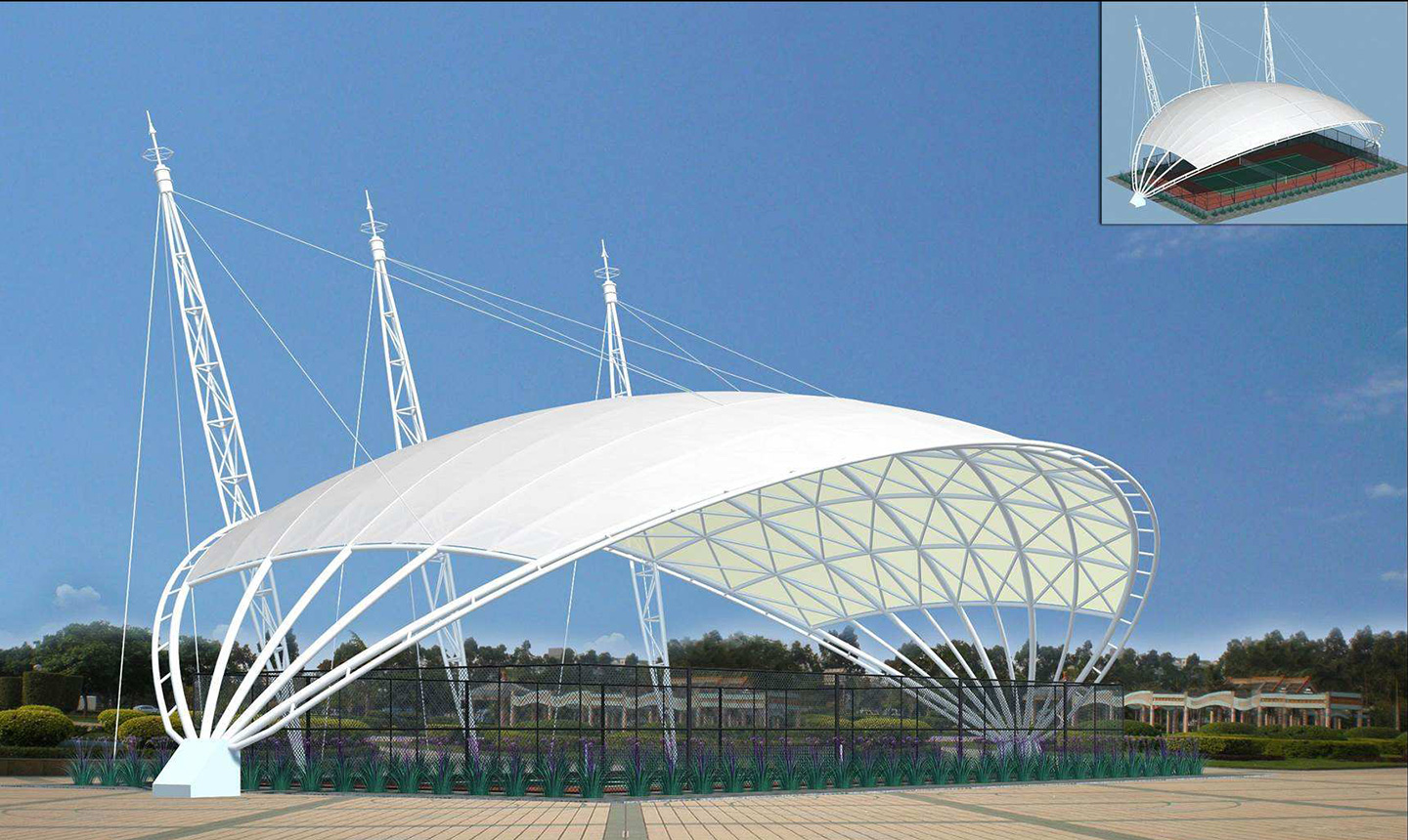 一、對(duì)于場(chǎng)地要求低,基本上所有球場(chǎng)地都可以做膜結(jié)構(gòu)頂棚,相比混凝土結(jié)構(gòu)的風(fēng)雨球館,施工周期短,造價(jià)低。