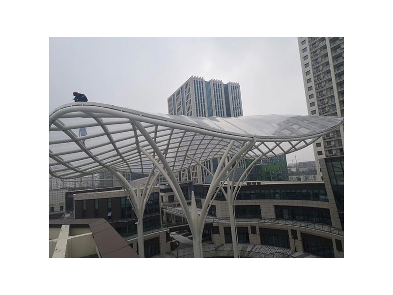 “ETFE”是英文Ethylene Tetra Fluoro Ethylene的縮寫,中文名稱為乙烯-四氟乙烯共聚物。ETFE膜材具有較高的抗拉強(qiáng)度、抗沖擊強(qiáng)度及抗撕裂能力。ETFE膜材的厚度通常在0.05~0.25mm。隨著厚度的增加,膜材的硬度將增加,同時(shí)也更脆,增大了加工難度。ETFE材料的典型用法是,將兩層或三層膜材“焊接”在一起,運(yùn)送到工地,然后充氣使它們膨脹成氣枕。