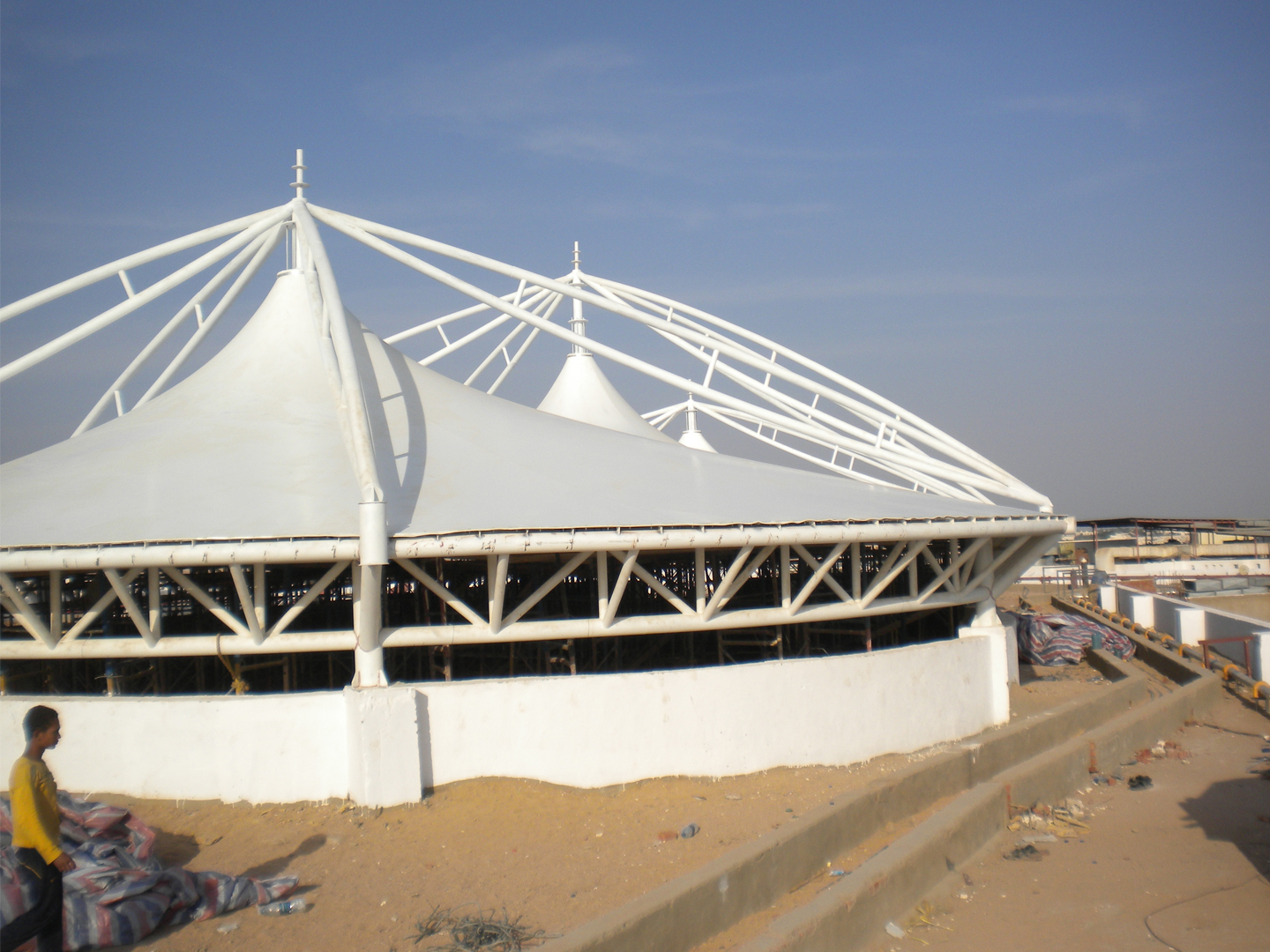 PVDF膜結(jié)構(gòu)材料是由膜結(jié)構(gòu)聚脂纖維加PVDF涂層而成, 更高級的PVDF膜結(jié)構(gòu)材料涂有二氧化鈦,材料自潔性極高。 PVDF膜結(jié)構(gòu)材料具有光觸媒的有機物分機能(氧化分解),對去除臟污有顯著的效果。