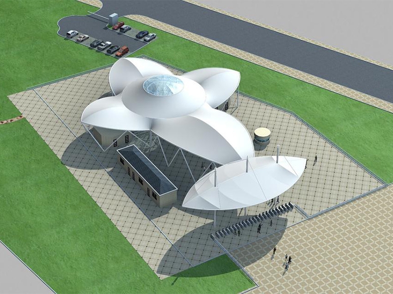 張拉膜工程膜結(jié)構(gòu)屋面采用鋼結(jié)構(gòu)構(gòu)件踩踏固定,形成穩(wěn)定的結(jié)構(gòu)體系,由各種高強(qiáng)度薄膜材料(PTFE、ETFE)、加強(qiáng)構(gòu)件、鋼索和錨固系統(tǒng)等組成空間結(jié)構(gòu)形式,并采用柱吊和鋼在膜上施加力來(lái)實(shí)現(xiàn)一種穩(wěn)定的狀態(tài),從而用美麗的膜結(jié)構(gòu)形式覆蓋鋼結(jié)構(gòu)表面。該施工工藝具有施工精度高、結(jié)構(gòu)性能強(qiáng)、等特點(diǎn)。