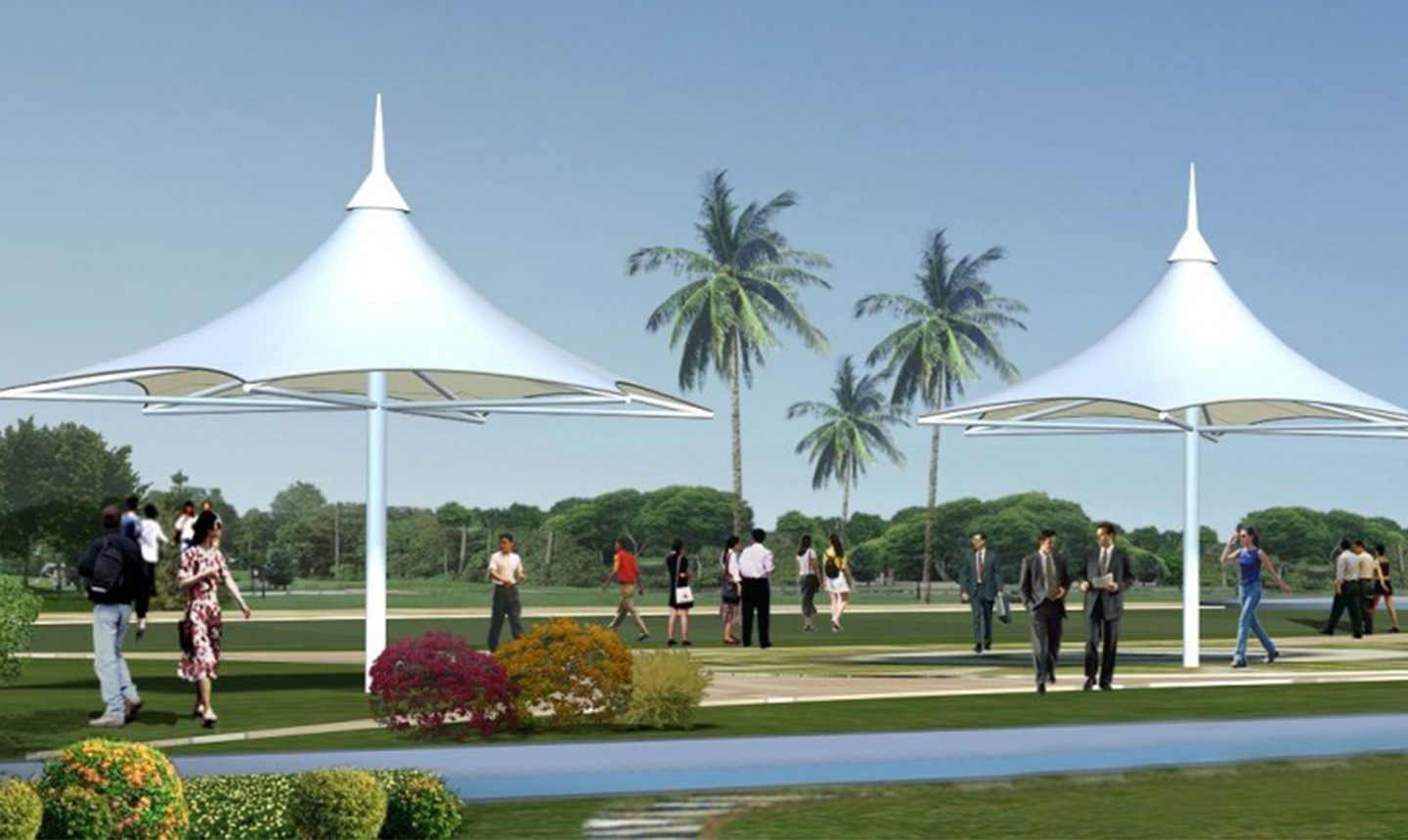 膜結(jié)構(gòu)景觀棚輕巧、別致的造型在停車場(chǎng)及候車廳的建設(shè)中起到重要作用,除了滿足防風(fēng)雨、防日曬等基本功能外,并有較好的標(biāo)識(shí)招攬效果,展現(xiàn)了人們個(gè)性化的一面。如果你想有陰影覆蓋或擴(kuò)大你的建筑特征,在短時(shí)間內(nèi)改變,除了木頭,石頭,金屬和玻璃材料的使用,另一種合適的材料是膜結(jié)構(gòu)景觀棚)。用PVC和PTFE膜,因此他們可以以低成本設(shè)計(jì)場(chǎng)館的屋頂結(jié)構(gòu)所需的形狀,這些材料可以被成功地用于幾乎所有的景觀或建筑環(huán)境,而且不受任何天氣條件的影響。膜結(jié)構(gòu)景觀棚的其他優(yōu)點(diǎn)是制造和安裝時(shí)間短,便宜的價(jià)格,高,拉伸和橫向的優(yōu)勢(shì)。